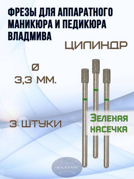 </section> <hr> <section>Discover the VladiMiVa diamond carbide nail bit, perfect for professional electric manicures and pedicures. This cylinder-shaped bit features a coarse grit abrasive for powerful yet controlled filing. The base is medical-grade stainless steel with electroplated natural diamond in a multi-layer process for superior cutting action. Manufactured in Russia, this high-quality diamond bit offers excellent durability, cutting performance, and operational stability. It is easy to disinfect. Part number ISO 876.104.107.080.033 denotes the green banding for coarse grit (125-160).