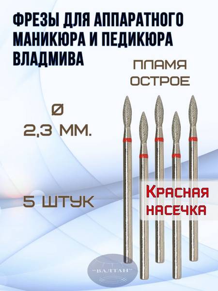 </section> </article> <hr> <article>Achieve flawless manicures and pedicures with VladMiVa's high-quality diamond nail drill bits. This set of 5 sharp flame bits features a fine grit abrasive, perfect for delicate nail work. The durable stainless steel shank is coated with high-density natural diamond for enhanced cutting efficiency and longevity. Made in Russia, these bits are built to last and meet rigorous quality standards. Easily disinfectable, they ensure hygienic and effective nail care. Part Number: ISO 856.104.243.080.023 (Red Band - Fine 40-80 Grit).