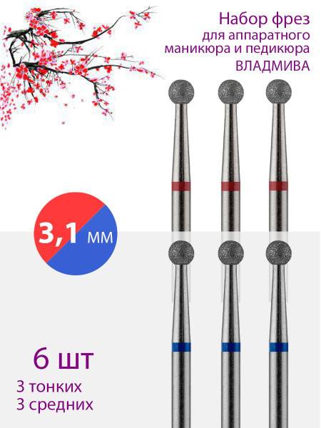 Achieve a flawless finish with the VladMiVa Diamond Cutters Set for professional manicure and pedicure. This 6-piece collection features ball-shaped diamond bits with fine (red) and medium (blue) grit for safe and effective cuticle and sidewall refinement. In pedicure, these diamond-coated attachments expertly smooth cracked heels and small areas of calloused skin.