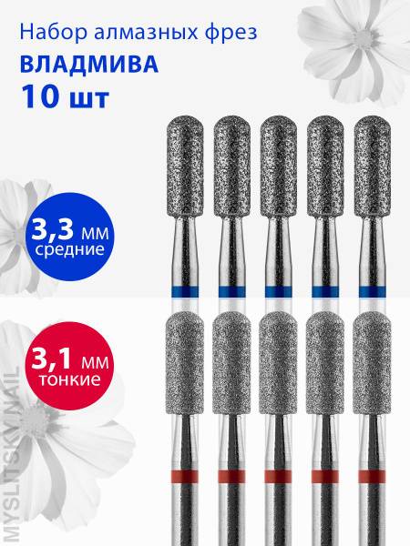 VladiMiva Diamond Nail Drill Bits Set for Manicure, Pedicure & Cuticle - Cylinder (Torpedo) - Fine/Medium Grit (Red/Blue) - 10 Pcs Pack - 806 104 141 031/33