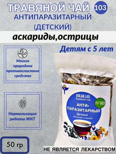 Antiparasitic herbal tea, ascaris, pinworms, intestinal parasites, roundworms, flatworms, lamblia, opisthorchis, liver cleanse, gallbladder cleanse, natural parasite cleanse, herbal remedy, Volgalad-103, phytotherapy, chamomile, thyme, herbal detox, natural health, gut health, parasite treatment, organic herbal tea, 50g.
