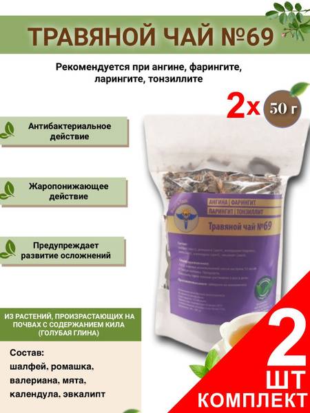 VolgaLad-69 herbal tea blend offers comprehensive relief from sore throat infections like angina, pharyngitis, laryngitis, and tonsillitis. Its antibacterial, anti-inflammatory, astringent, antipyretic, and blood-purifying properties effectively combat infections of the nasopharynx. This blend is recommended for chronic tonsillitis, acute angina, laryngitis, pharyngitis, and acute respiratory viral infections (ARVI). The herbal infusion reduces swelling in the tonsils and larynx, prevents mucus buildup, and alleviates throat pain. Rich in vitamins and strengthening herbs, it helps prevent complications and promotes faster recovery. Ingredients include sage leaf, chamomile flower, valerian root, mint leaf, calendula flower, and eucalyptus leaf.