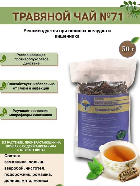 VolgaLad-71, herbal tea, stomach polyps, intestinal polyps, polyp treatment, natural remedy, digestive health, gut health, anti-inflammatory, anti-tumor, resorptive, hepatoprotective, detoxifying, chamomile, St. John's Wort, Mugwort, Celandine, Plantain, Strawberry leaf, Sweet Clover, Peppermint, Lemon Balm, herbal supplement, phytotherapy.