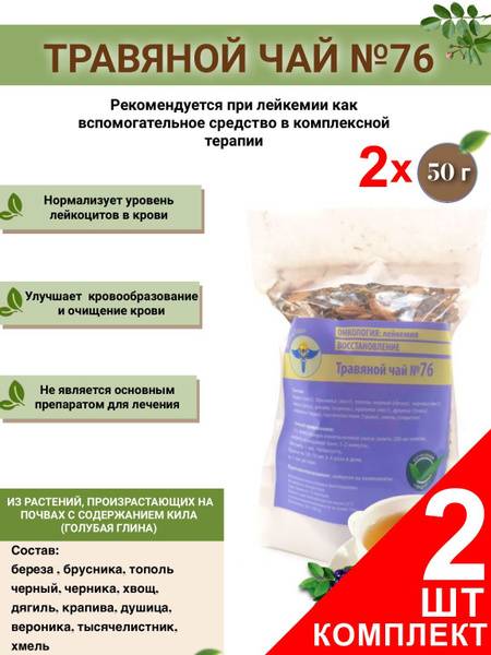 Keywords: leukemia herbal tea, leukemia support, herbal remedy for leukemia, natural support for leukemia, VolgaLad-76, blood purification, immune system booster, white blood cell count, blood formation, herbal blend, phytotherapy, complementary therapy, leukemia treatment support, birch leaf, blueberry leaf, poplar buds, bilberry leaf, horsetail, angelica root, nettle leaf, oregano, speedwell, yarrow, hops.