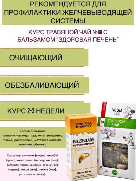Discover an unparalleled opportunity to support your gallbladder and liver health with our natural, preventative care course. Volgalad-88 herbal tea is formulated to aid in liver cell regeneration, inhibit the production of harmful cholesterol, and reduce cholesterol absorption into the bloodstream. Our "Healthy Liver" balsam works to normalize liver and gallbladder function, offering anti-inflammatory and choleretic benefits, while also helping to regulate cholesterol levels. Please refer to the instructions for detailed usage.