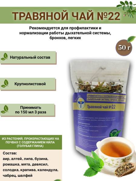 Description: VolgaLadya Herbal Tea No. 22 is a carefully crafted blend designed to support and promote healthy respiratory function. This preventative formula helps stimulate and normalize the activity of the respiratory system, including the bronchi and lungs.