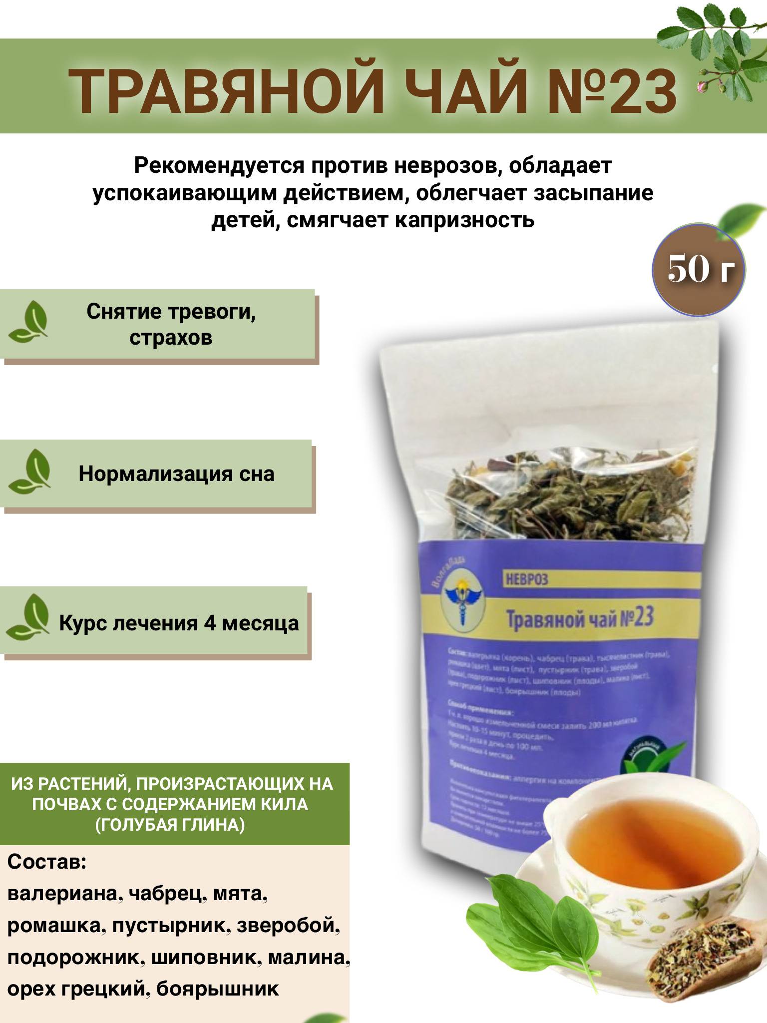 Soothe anxiety and promote relaxation with VolgaLadya Herbal Tea No. 23. Formulated by Academician O.G. Seleznev, DMN, this calming blend helps ease nervousness, improve sleep in children, and reduce irritability. A natural approach to nervous tension. This organic herbal tea uses a traditional recipe with natural ingredients for stress relief and restful sleep. It's a great natural remedy for nervousness and a calming tea for kids.