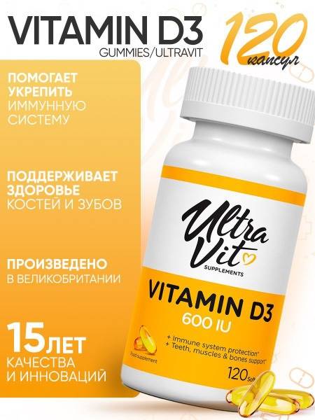 Vitamin D3, Vitamin D3 600 IU, VPLAB UltraVit, Vitamin D3 supplements, immune support, bone health, teeth health, calcium absorption, hair loss, depression, pregnant women, breastfeeding women, dietary supplements, nutritional supplements, UK manufactured, Russia, softgels, 120 capsules, family-sized, high-potency, immunomodulator.