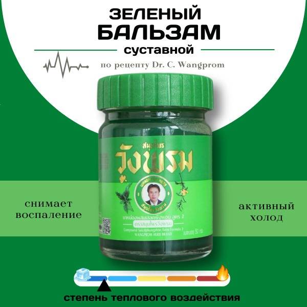Wang Prom, Thai balm, green balm, cooling balm, pain relief, inflammation, arthritis, radiculitis, bruises, sprains, insect bites, nasal congestion, swelling, muscle pain, joint pain, back pain, leg pain, varicose veins, veno-tonic, warming balm, herbal balm, Thai herbal remedy, natural remedy, muscle relaxant, sports balm, Thailand, massage balm, 50ml, effective pain relief, fast acting.