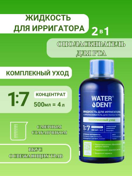 Experience superior oral hygiene with WaterDent Complete Care Irrigator Fluid & Mouthwash. This versatile 500ml concentrate provides comprehensive protection against common oral health issues. Its unique formulation combines the power of natural extracts – including soothing chamomile, anti-inflammatory St. John's wort, and immune-boosting echinacea – with the benefits of bischofite (ancient sea salt) to strengthen enamel and combat bacteria. BioSol, our antimicrobial component of natural origin, further enhances its effectiveness.