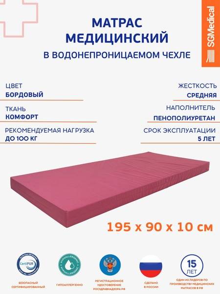 The Comfort medical mattress with a waterproof cover is the perfect solution for caring for bedridden patients at home or in any setting requiring a waterproof mattress. Its non-slip, waterproof cover prevents sheet slippage, ensuring maximum patient comfort. The breathable, hypoallergenic cover is safe and prevents the build-up of moisture. The durable, elastic polyurethane foam filling, unlike inferior materials, retains its shape and prevents sagging over time, supporting up to 130 kg. For optimal longevity (minimum 5 years of continuous use), we recommend flipping the mattress every 3 months. Suitable for medical facilities, the mattress cover is easily cleaned with disinfectants and can be washed and ironed. The filling holds CertiPUR international safety certification, and the mattress is registered as a medical device with a registration certificate from Roszdravnadzor (Russian Federal Service for Surveillance in Healthcare).