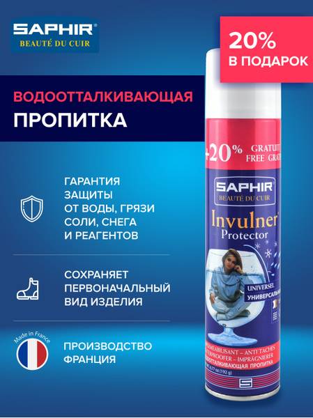 Invulner & Saphir's premium water repellent spray provides superior protection for all types of leather (smooth, nubuck, suede), textiles, and high-tech fabrics including breathable membranes. Fluorocarbon resins create a durable water-resistant barrier, preventing water, salt, and snow stains. Extend the life and preserve the appearance of your shoes, clothing, and bags while maintaining breathability. Colorless, 300ml aerosol. Ingredients: Propellant gas (butane), solvents, resins.