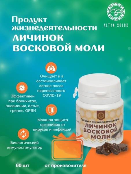 Altyn Solok offers Greater Wax Moth (GWM) larvae extract tablets – a natural immune booster and expectorant directly from the manufacturer. GWM exhibits potent antibacterial, antiviral, anti-inflammatory, and restorative properties, significantly enhancing the body's defenses.