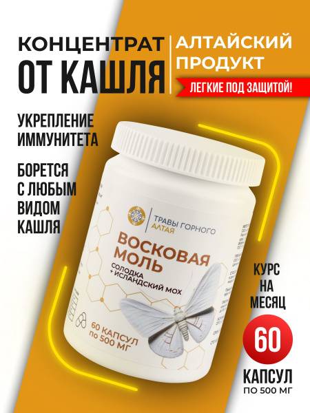 Wax moth, Greater Wax Moth, Galleria mellonella, огневка, Altai, Altai herbs, natural remedies, immune support, respiratory health, cough, bronchitis, asthma, Icelandic moss, Cetraria islandica, licorice root, Glycyrrhiza glabra, succinic acid, dietary supplement, capsules, natural ingredients, immune booster, cold remedy, anti-inflammatory, antibacterial, antiviral, expectorant.