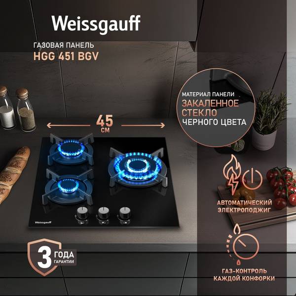 Weissgauff, gas cooktop, gas hob, 45cm cooktop, built-in gas cooktop, tempered glass cooktop, black gas cooktop, wok burner, 3.8kW burner, cast iron grates, gas safety, automatic ignition, SABAF burners, HGG 451 BGV, kitchen appliances, Italian burners, German engineering.