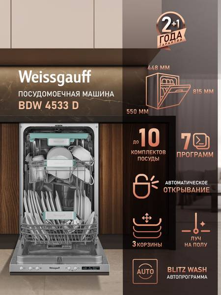 Peace of mind is ensured with the full AquaStop leak protection system, providing complete protection against water damage. This feature offers 100% assurance against leaks, protecting both your home and your belongings. Experience the ultimate in cleaning performance and convenience with the Weissgauff BDW 4533 D – your perfect kitchen companion.