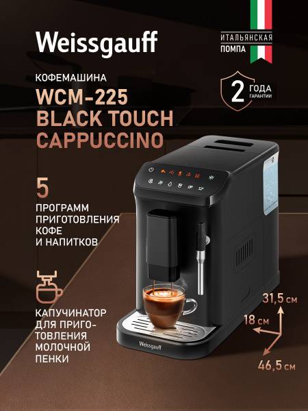 Experience barista-quality coffee at home with the Weissgauff WCM-225 automatic bean-to-cup coffee machine. This sleek, black matte machine boasts a user-friendly touch screen interface and 5 pre-programmed options for effortless coffee creation: Espresso (single & double), Americano, Cappuccino/Latte, hot water, and milk frothing. A powerful 20-bar Italian pump ensures rich, balanced flavor in every cup.