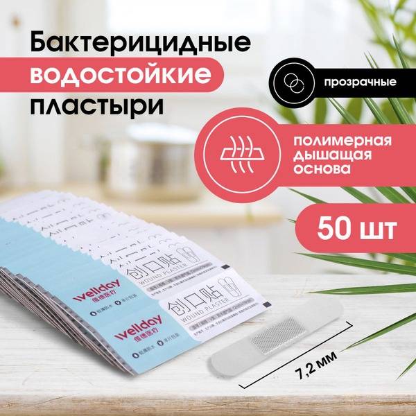 Wellday's daily-use transparent bandages offer superior protection and healing for minor cuts, scrapes, and blisters. Made with an elastic, breathable polymer, these hypoallergenic bandages feature a non-stick, atraumatic pad infused with antiseptic for antibacterial action. The clear design makes them virtually invisible on skin, suitable for all body areas. Their strong, yet gentle adhesive ensures secure, pain-free removal, even after intense activity. These waterproof bandages provide reliable protection and comfort for both children and adults. Each pack contains 50 sterile, non-toxic bandages measuring 7.2 x 1.9 cm. Ideal for everyday use and first aid.