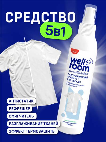 Fabric refresher spray, liquid iron spray, anti-static spray, odor eliminator, wrinkle remover, fabric softener, clothing care, travel essential, Russian-made, Wellroom, 200ml, fresh scent, wrinkle release spray, clothing refresher, laundry care, thermal protection, 5-in-1, pet hair remover, dust repellent