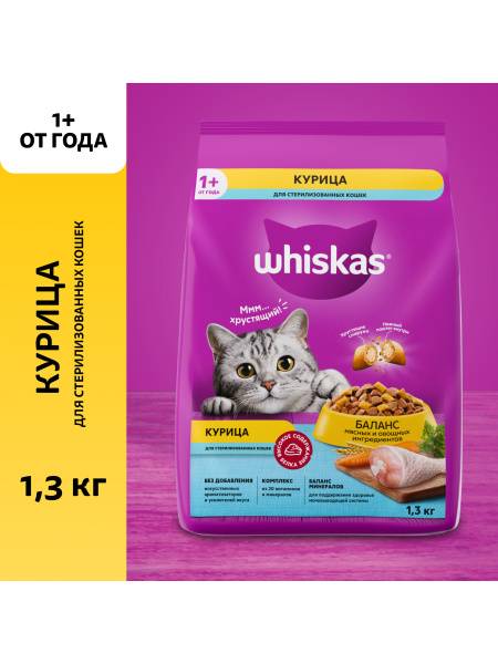WHISKAS® is crafted with care, providing a balanced blend of meat and vegetables to ensure your sterilised cat receives complete nutrition. High-protein, high-quality ingredients support their health at every stage of life. Your cat will purr with delight at the irresistible crunchy bites with a tender, tasty interior. Delight your feline friend with a variety of WHISKAS® options – combine this dry food with crunchy bites and our delicious wet food range, including juicy jellies, appetising ragouts, or smooth patés, for a truly satisfying meal experience.