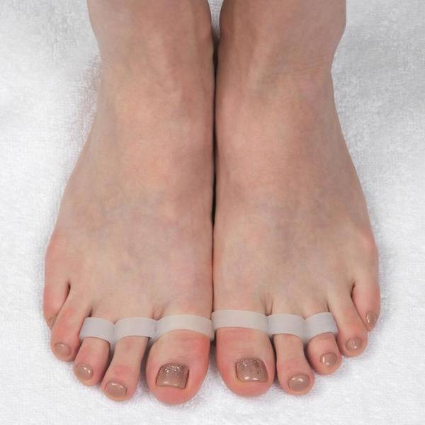 Comfortable and effective white toe separators designed to correct bunions, overlapping toes, and other foot alignment issues. This pair provides gentle support for three toes, promoting proper alignment and relieving pressure points. Ideal for everyday wear or use during activities.