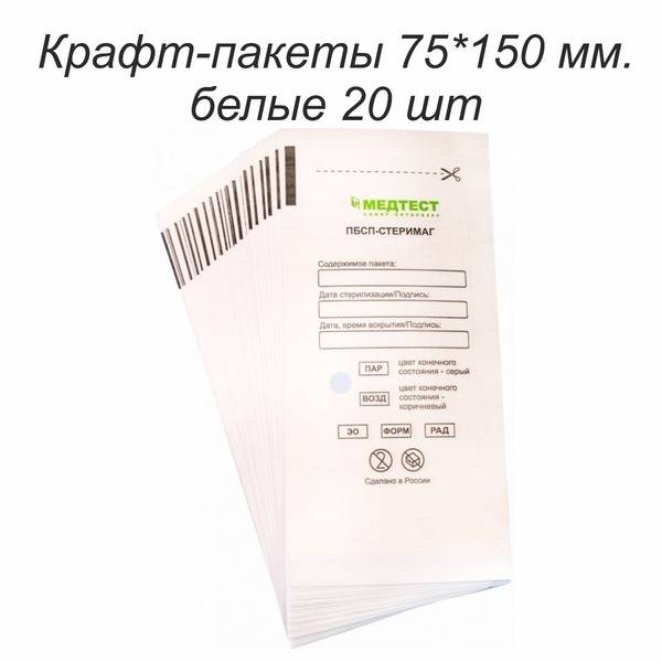 These self-adhesive kraft paper pouches (75x150mm) are designed for steam, gas (EO), and air sterilization. Their permeable design ensures effective sterilization while maintaining a hermetic seal to prevent microbial contamination after processing. A clear sterilization indicator provides visual confirmation of completed sterilization. No special equipment is needed for sealing – simply peel and stick for easy, reliable use. This pack contains 20 pouches.