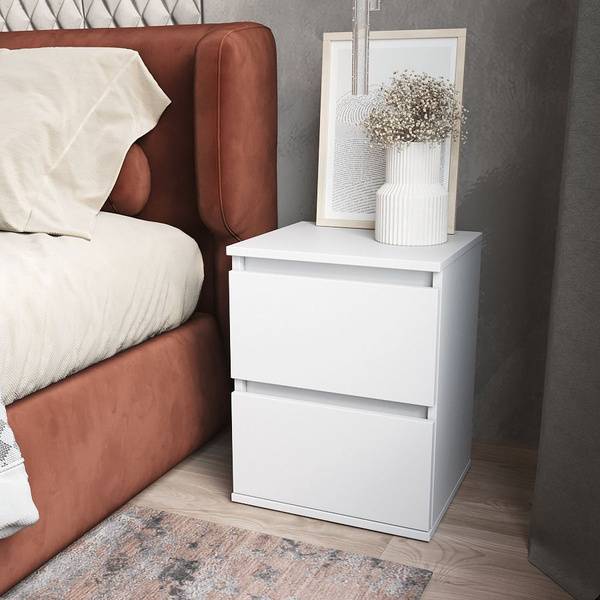 This sleek, white minimalist nightstand offers both style and functionality. Featuring two smooth-gliding drawers on full-extension ball bearing slides, this compact bedside table is perfect for any bedroom. Its narrow profile maximizes space, making it ideal for smaller rooms or apartments.
