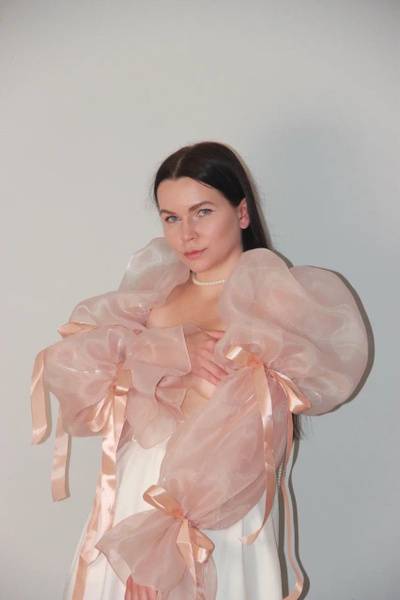 Description: Indulge in the luxurious ZHULEVÁ organza blouse, a unique garment featuring stunning ribbon sleeves. These lightweight, voluminous sleeves can be tied into charming bows or left flowing freely for a graceful, effortless look. Create an unforgettable and unique style with this exquisite piece. Made in St. Petersburg, Russia, it's available in three sophisticated colors: coffee with milk, ivory, and powder pink. Crafted from premium 100% polyester organza.