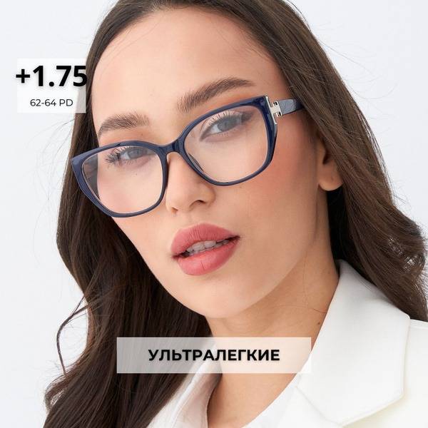 Stylish and fashionable women's +1.75 diopter reading glasses featuring a trendy cat-eye frame. These lightweight, transparent glasses with a blue plastic frame offer comfortable, all-day wear. Crafted with durable, shatter-resistant organic plastic lenses, these glasses provide clear vision and superior protection compared to glass. The comfortable fit and elegant design make them suitable for women of all ages, from teens to mature adults, complementing various styles, including Korean fashion. The glasses come complete with a protective case to prevent scratches and extend their lifespan. Perfect for both near and far vision correction, these glasses are meticulously crafted to meet quality standards and offer a precise focus. Our range includes various diopters to suit individual needs, eliminating the need for custom-made glasses. Experience the perfect blend of style, comfort, and superior vision correction with these sophisticated +1.75 reading glasses.