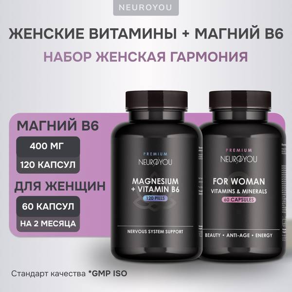 Description: NeuroYou Women's Harmony is a powerful 2-in-1 supplement designed to support women's health and beauty. This comprehensive system includes a multivitamin complex with 13 essential vitamins and 10 minerals (60 capsules) and Magnesium B6 (120 capsules) to promote optimal well-being. The multivitamin provides balanced nutrition for enhanced immunity, energy, and radiant skin, hair, and nails. Magnesium B6 supports nervous system function, muscle health, and energy metabolism, while also potentially reducing stress. Ideal for pregnant and breastfeeding women, this combination helps maintain healthy bone density and prevents calcium imbalances. Both supplements are safe for pregnant and breastfeeding women (when used as directed). Consult your doctor before use. Each bottle comes with a 2-year (multivitamin) or 3-year (Magnesium B6) shelf life.