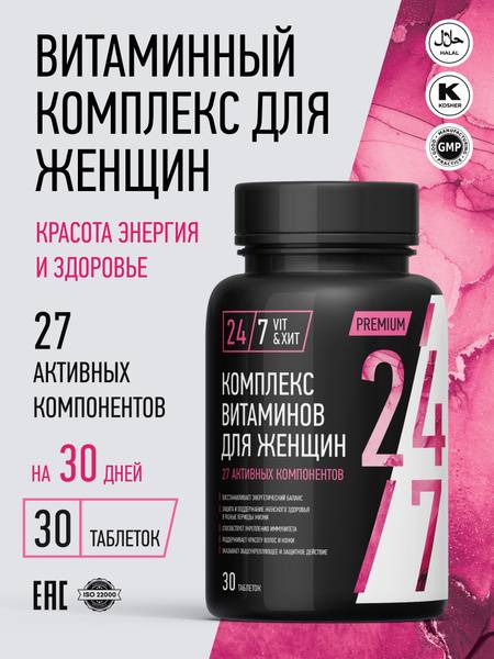 women's multivitamin, women's vitamins, vitamins for women, vitamin supplement, health supplement, immune support, energy boost, skin health, hair health, nail health, reproductive health, stress reduction, antioxidant, vitamin A, vitamin C, vitamin D3, vitamin E, B vitamins, iron, magnesium, zinc, GMP certified, Kosher certified, Halal certified, 24/7 VIT&HIT, EAEU certified, women's health, beauty supplement, youthful vitality, healthy aging.