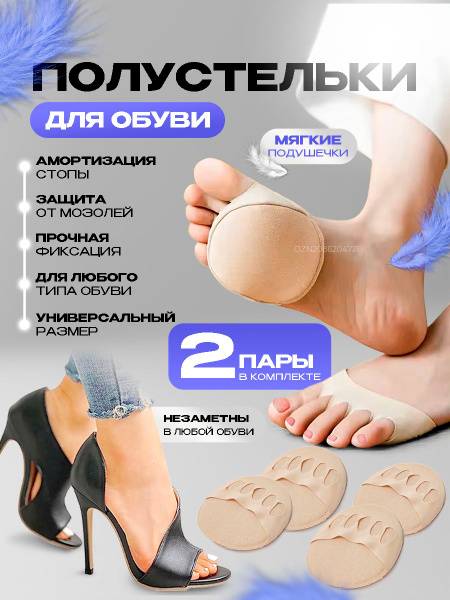 Experience ultimate comfort with our Women's Orthopedic Shoe Inserts, a set of 2 pairs (4 individual pads). These versatile half-shoe insoles are perfect for any footwear, including open and closed-toe heels, sandals, flats, loafers, moccasins, sneakers, and dance shoes. Say goodbye to foot fatigue, even with high heels! The soft cushioning under the forefoot absorbs impact, making every step comfortable. Transform even the most uncomfortable shoe into a wearable favorite.