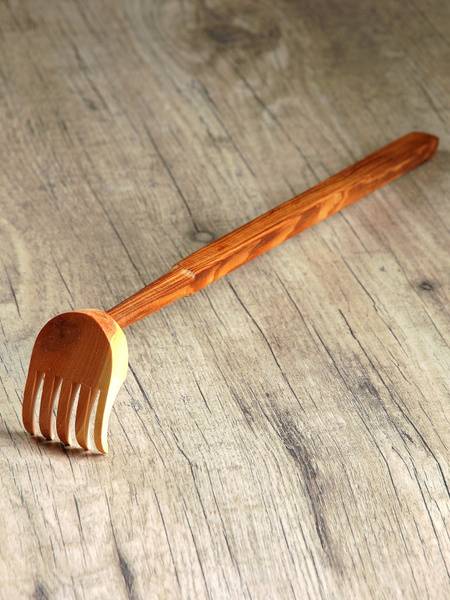 Experience soothing relief from tension and fatigue with our handcrafted wooden back and head scratcher. This simple yet effective massage tool is perfect for targeting back and head tension, but can also be used to massage other areas of the body. Its gently scratching teeth provide a relaxing massage, promoting muscle relaxation and calming the nervous system. Simply glide the scratcher across your skin using light, scratching motions to enjoy the blissful sensation. Dimensions: 6 x 5 x 37 cm.