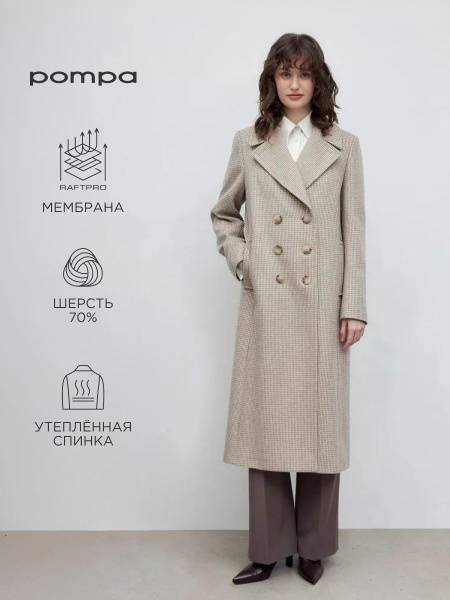 Indulge in the timeless elegance and exceptional warmth of the POMPA wool blend coat. This beautifully crafted double-breasted coat is made from a luxurious 70% wool tweed in a soft beige-brown pied-de-poule pattern. The classic English collar, which can be fully fastened, and the stylish set-in sleeves create a sophisticated and comfortable silhouette. Two front relief seams create a flattering semi-fitted shape, while generously sized welt pockets offer practical convenience. Delicate topstitching adds a touch of refined detail.