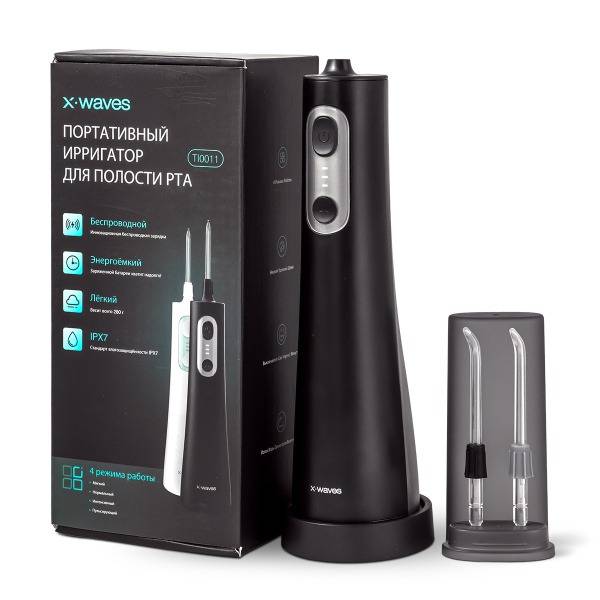 Description: The X-Waves portable oral irrigator offers superior oral hygiene in a compact, ergonomic design. Perfect for preventing cavities and periodontal disease, maintaining orthodontic appliances, implants, and dentures, and promoting implant osseointegration, this irrigator effectively combats gum disease and bad breath. Featuring four modes – soft, normal, intense, and pulsating – with a powerful 690 kPa water pressure, it ensures thorough cleaning. Its IPX7 waterproof rating guarantees durability, while the 165ml water reservoir provides ample capacity. Conveniently charge via USB using a laptop or phone charger with the included stand (no messy cords!). A full charge (2-3 hours) provides up to 30 days of use (twice daily) thanks to its 1400 mAh battery. Includes 2 standard nozzles and a travel case. Lightweight at just 280g, making it ideal for travel.