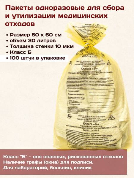 High-strength yellow Class B medical waste bags, measuring 500x600mm and holding 30 liters. This pack contains 100 bags, each featuring a 10µm thick wall for superior durability and puncture resistance. Pre-printed spaces on the bag eliminate the need for additional labels, simplifying waste management. Conveniently packaged in a folded format for easy storage and dispensing. Ideal for use with standard medical waste containers.