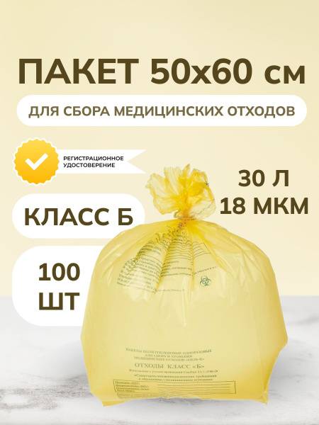 High-quality, yellow Class B medical waste bags, ideal for safely disposing of potentially infectious waste. Each bag boasts a 30-liter capacity, measures 50x60 cm, and features a robust 18µm thickness. Reinforced side gussets (110mm each side) ensure a secure seal and maintain the stated dimensions even when filled. These tie-less bags are designed for convenient and secure handling of various waste types, including: contaminated materials and instruments, patient secretions (including blood), pathological waste, organic surgical waste (organs, tissues, etc.), infectious ward waste (including food waste), waste from microbiology labs handling pathogens (groups 3-4), and vivarium biological waste. Manufactured from high-density polyethylene (HDPE) in accordance with GOST standards, these single-use bags meet SanPiN 2.1.7.2790-10 regulations and possess a registered medical device certificate (indicated on the permanent print). Each bag can hold up to 15kg. 100 bags per pack, 10 packs per carton. Order your reliable medical waste disposal solution today!