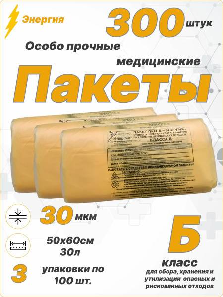 Energia high-strength polyethylene medical waste bags are designed for the safe disposal of Class B medical waste. Each pack contains 300 heavy-duty bags (3 x 100-count packs), measuring 50x60cm (30 liters) with a robust 30-micron thickness. These bright yellow bags, clearly marked for Class B waste, meet all relevant safety and regulatory standards for secure collection, storage, and disposal of potentially infectious materials and epidemiological instruments.