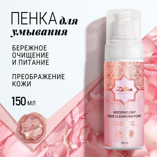 Zeitun, Wedding Day, cleansing foam, facial cleanser, hydrating cleanser, hyaluronic acid, rose water, Damask rose oil, aloe vera, panthenol, lactic acid, allantoin, acne treatment, sensitive skin, oily skin, dry skin, combination skin, anti-aging, skin regeneration, makeup remover, natural skincare, skincare routine, 150ml, facial foam, beauty products, skincare products.