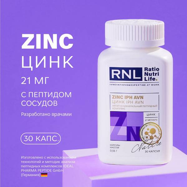 "description": "Support your immune system, healthy skin, hair, and nails with RNL Zinc 21mg. This supplement, formulated with a vascular peptide and manufactured using IDEAL PHARMA PEPTIDE GmbH (Germany) technology, helps maintain hormonal balance. 30 capsules per bottle.",