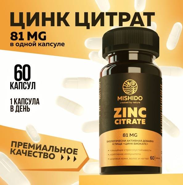 Mishido Zinc Citrate Biocaps deliver highly bioavailable zinc in its citrate form, rapidly replenishing zinc deficiencies. This essential mineral plays a crucial role in macronutrient metabolism, protein synthesis, and maintaining healthy hair and nails. Zinc's antioxidant properties protect cells from oxidative stress, support healthy testosterone levels, boost immunity, and improve cardiovascular health by helping to clear cholesterol from arteries. It may also help reduce the risk of chronic diseases like diabetes, cancer, and heart disease. Zinc helps fight inflammation, shortens the duration and severity of common colds, and enhances cognitive function, improving memory and overall well-being. It regulates blood sugar levels and participates in insulin secretion. By stimulating collagen production, zinc improves skin elasticity, reduces wrinkles, and aids in acne treatment. It also supports prostate health and reproductive function in both men and women. Mishido Zinc Citrate Biocaps are suitable for adults, teens, and athletes. Experience the comprehensive health benefits of this powerful supplement.