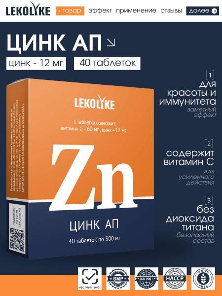 Zinc supplement, Zinc AP, Vitamin C, Zinc citrate, immune support, reproductive health, skin health, hair health, nail health, zinc deficiency, Lecolike, dietary supplement, 40 tablets, bioavailable zinc.