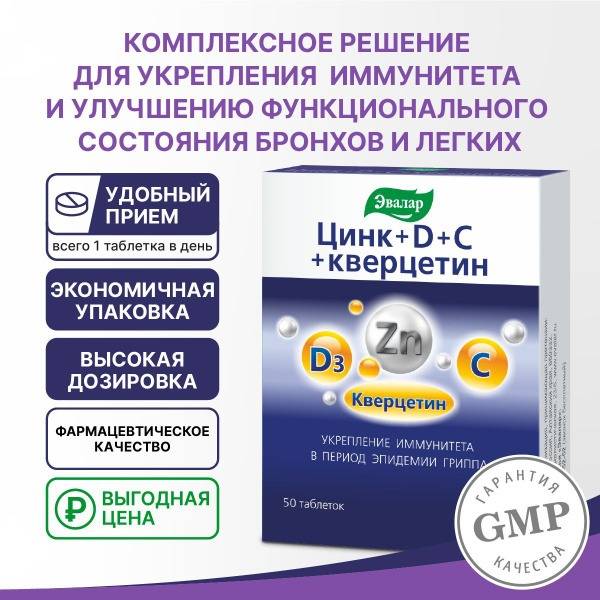 This expertly formulated dietary supplement provides comprehensive immune support when you need it most. Experience the difference of a strengthened immune system with Evalaar's Zinc + D + C + Quercetin. 50 tablets, 0.27g each. This immune booster helps with cold and flu prevention and viral infection support.
