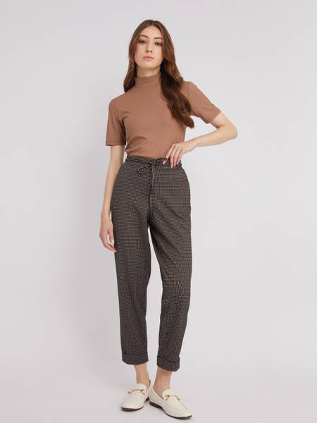 Experience ultimate comfort and style with Zolla's women's plaid jogger pants. These versatile pants are designed for modern living, blending effortless chic with all-day ease. Crafted from a stretchy knit fabric, they boast a flattering high-waisted, cropped, and tapered silhouette. The elastic waistband with drawstring ensures a perfect fit, while handy side pockets keep essentials close at hand. Stylish turn-ups at the ankles add a touch of sophistication. Perfect for pairing with tops, basic t-shirts, or loose-fitting blouses, these plaid joggers effortlessly transition from casual daytime looks to more dressed-up evenings. Available in plus sizes to ensure a perfect fit for every woman. Model is wearing size S; height 173 cm; Bust-Waist-Hips: 82-61-88 cm. Discover the complete Zolla collection of women's clothing, including jeans, jeggings, classic trousers, sportswear, shorts, skirts, and leggings.