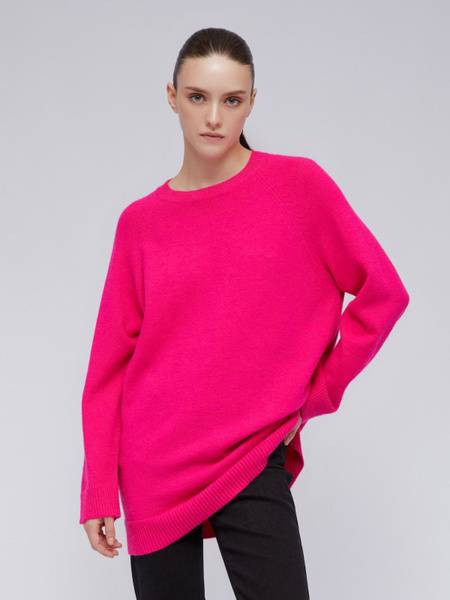 Description: This cozy, oversized pink knit jumper from Zolla is crafted from a soft blend yarn, perfect for adding warmth and style to your everyday looks. The relaxed fit pairs effortlessly with classic trousers, casual jeans, or feminine midi skirts. Featuring a comfortable round neckline, long raglan sleeves, and ribbed cuffs, hem, and neckline, this longline jumper offers both style and comfort. Zolla offers a wide selection of everyday, office, and loungewear, including basic jumpers, wool cardigans, chunky knit cardigans, turtleneck sweaters, and fine turtlenecks for girls, women, and teens. Model wears size S. Model height: 176.5 cm. Bust-Waist-Hips: 82-59.5-88 cm.