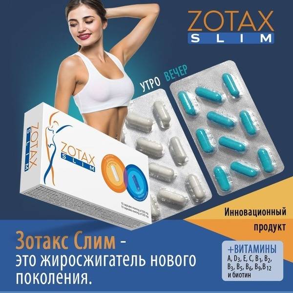 Description: Zotax Slim is a next-generation fat burner designed for comfortable and healthy weight loss with long-lasting results. We've created a unique formula combining proven weight-loss ingredients with added vitamins and beneficial nutrients for optimal well-being. This helps you shed excess fat and pounds while maintaining healthy skin, normal digestion, and sustained energy throughout the day. Simply take two capsules daily (morning and evening) – no laxative effects or harmful ingredients. Zotax Slim suppresses cravings, promotes satiety, improves sleep, and boosts nighttime fat burning. Achieve effective, safe, comfortable, and lasting weight loss with Zotax Slim.