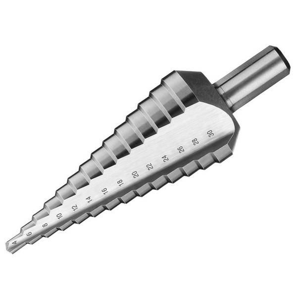 The ZUBR 4-30mm step drill bit is a high-performance tool ideal for drilling various materials. Its 14 steps cover a wide diameter range (4-30mm), making it perfect for sheet metal up to 4mm thick, non-ferrous metals, plastics, and more. Crafted from durable R6M5 high-speed steel, this versatile drill bit offers exceptional cutting capacity and longevity.